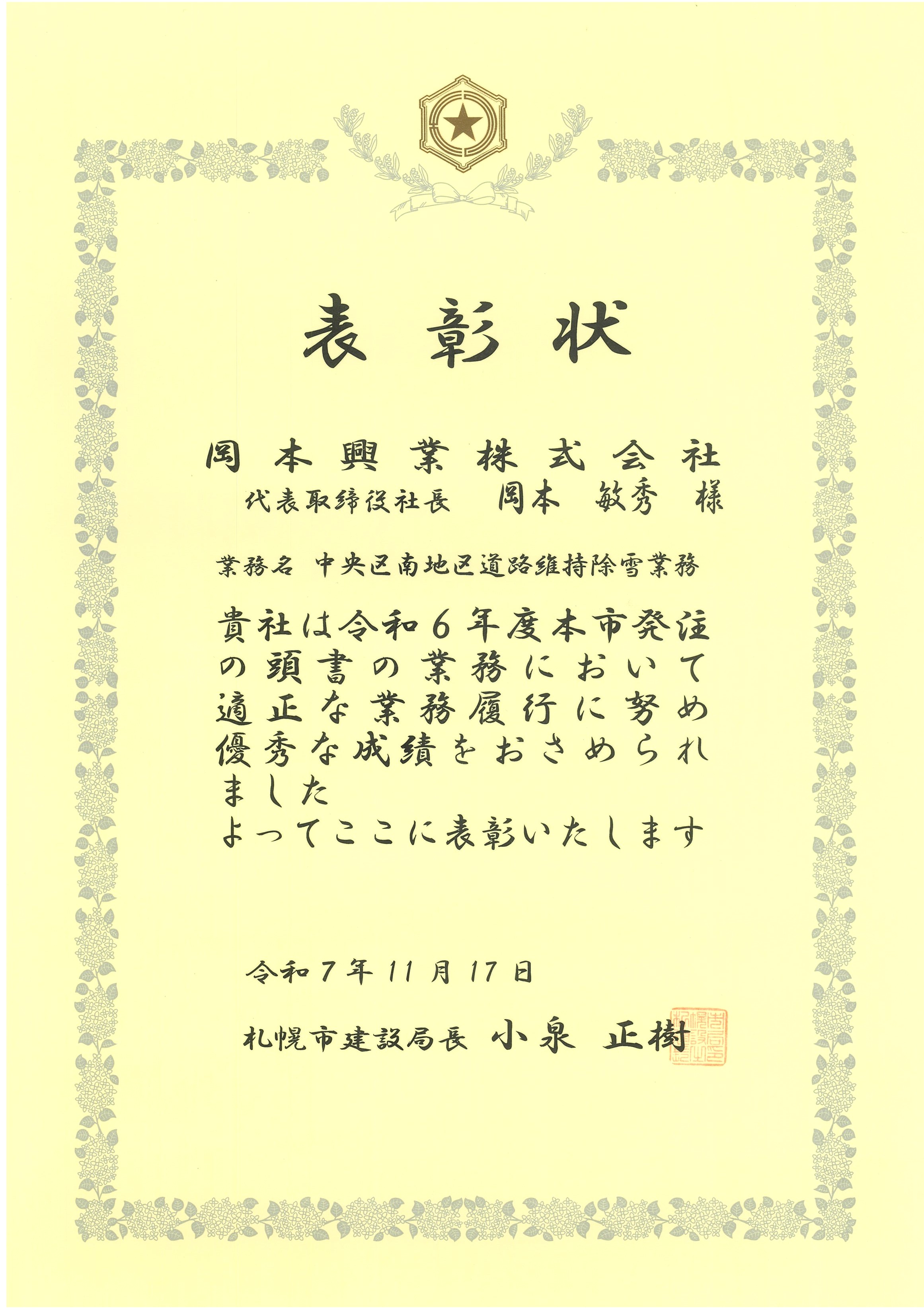 除雪業務において、札幌市建設局長より優秀な成績をおさめたことに表彰を受けました。